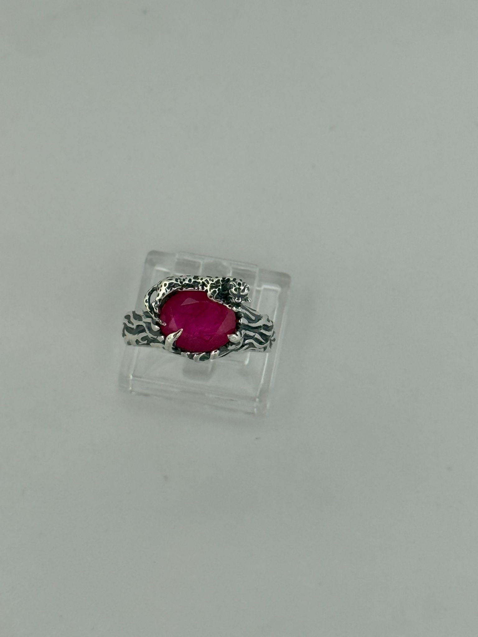 Anello in argento 925 con pietra centrale fuxia, taglio sfaccettato con pantera sulla pietra .