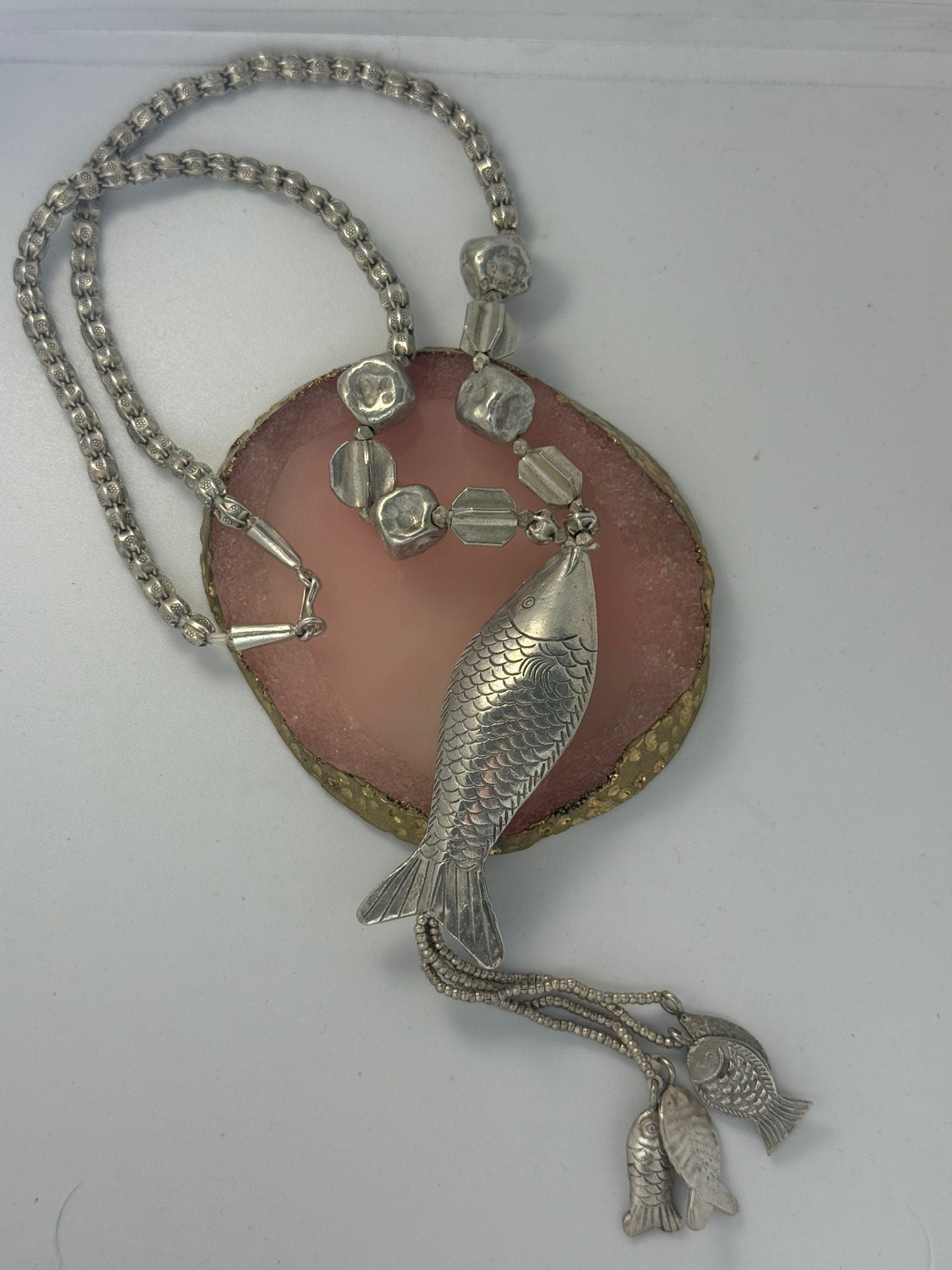 Collana lunga in argento 925 catena particolare con sfere martellate e peace bombato pendente con fili con altri pesciolini pendenti.