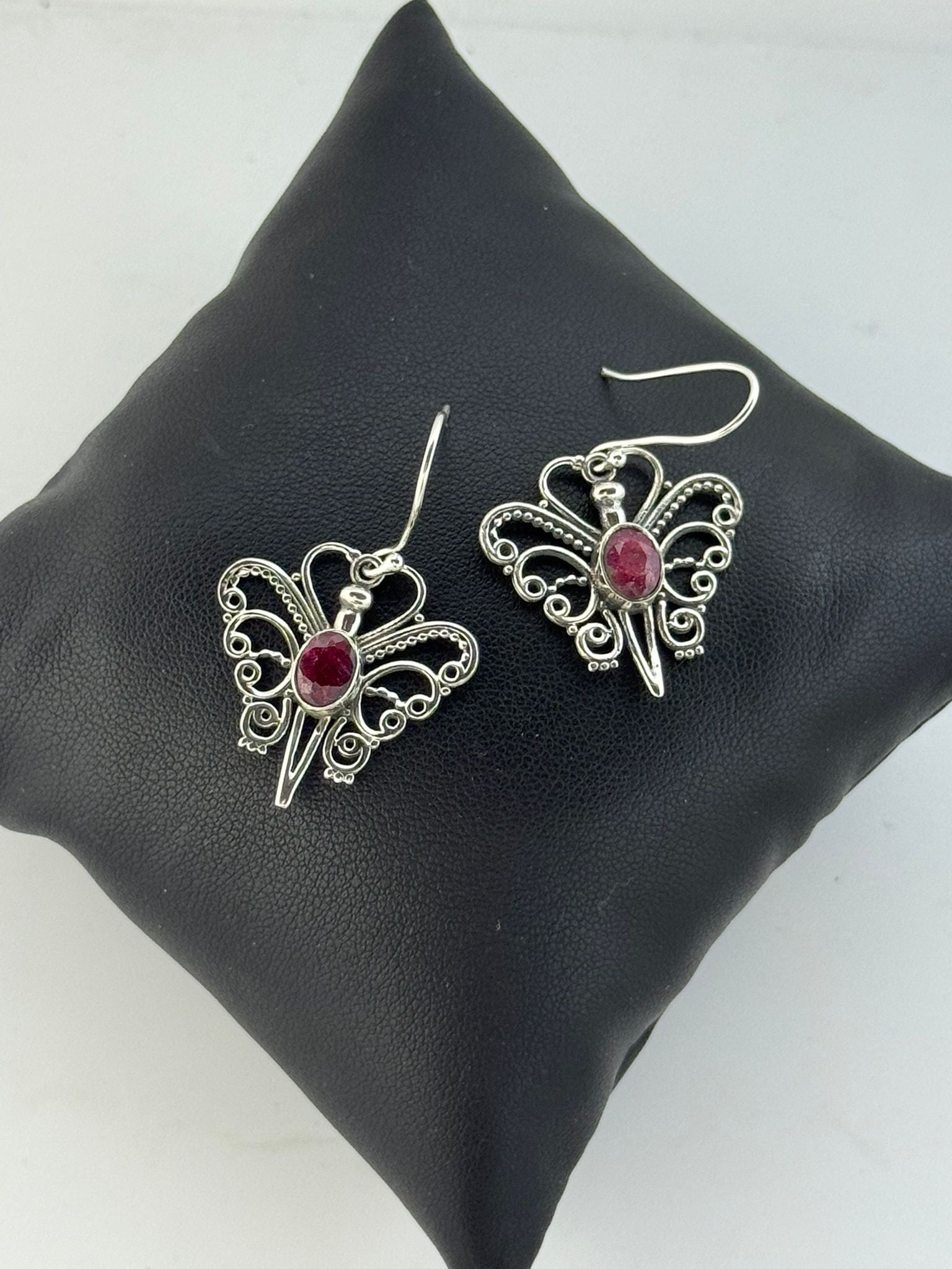 orecchini in argento 925 a forma di farfalla con pietre radice di rubino fuxia.
