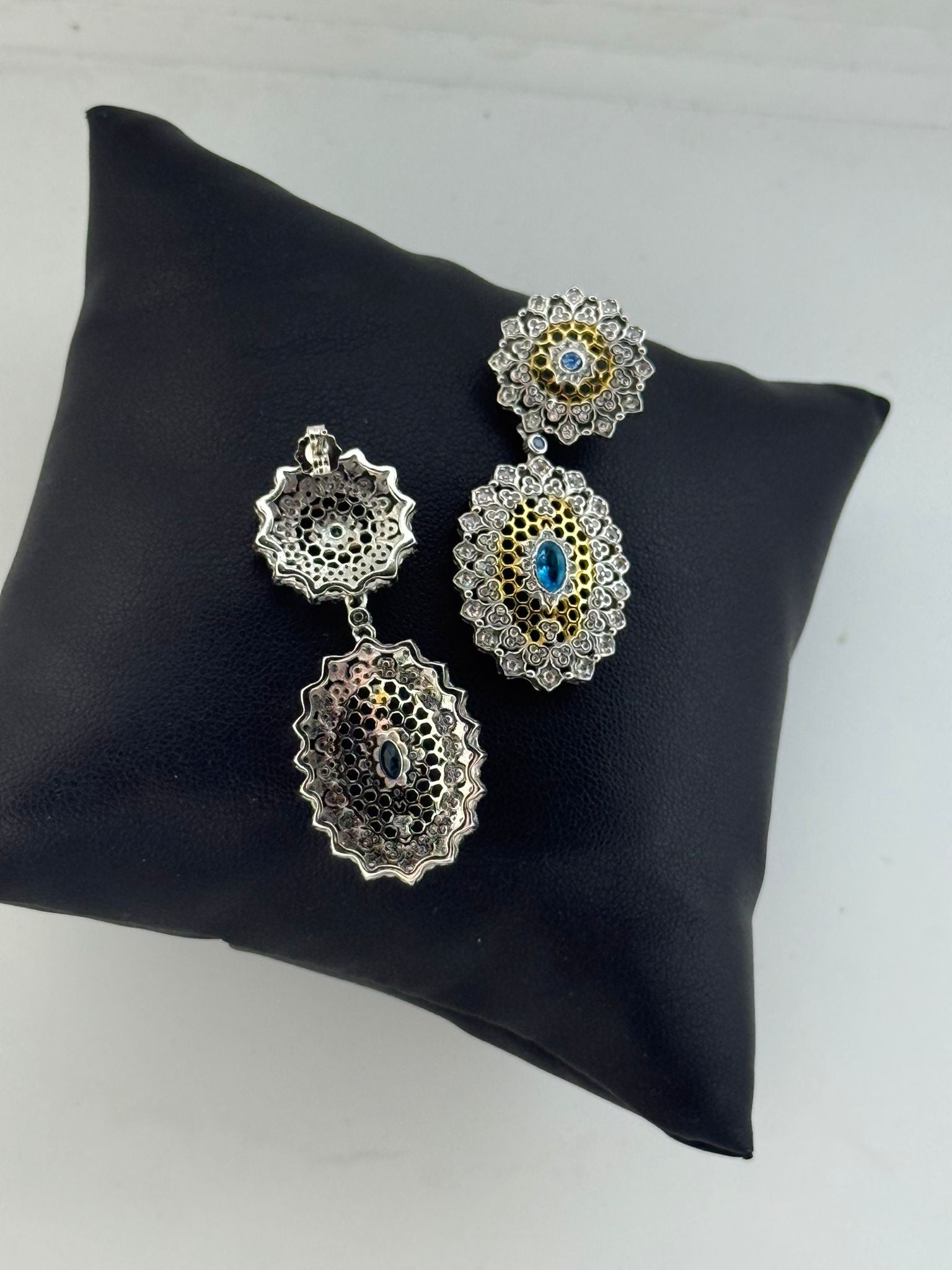 Orecchini in argento 925 pendenti con chiusura a foro. Arte decó, stile liberty. In argento e argento dorato, cornice di pietre bianche e pietra centrale topazio azzurro.
